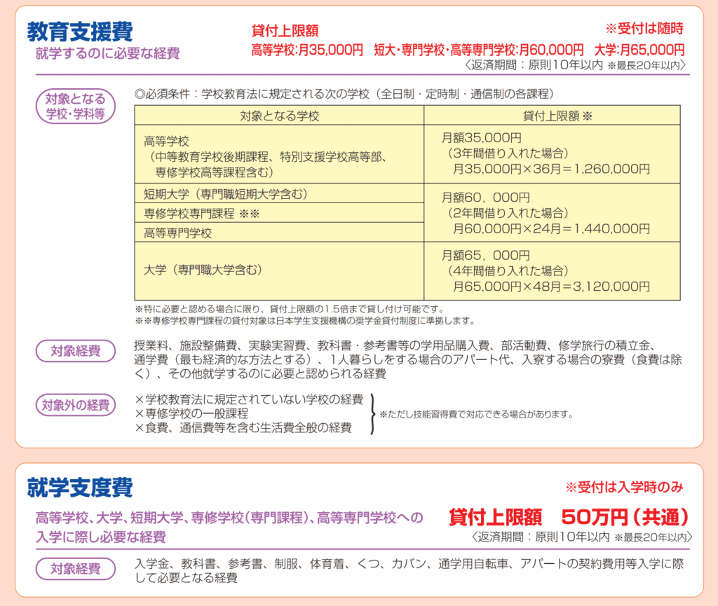 こちらであれば、保護者が連帯借受人となることで最大500,000円の貸付が受けられます。