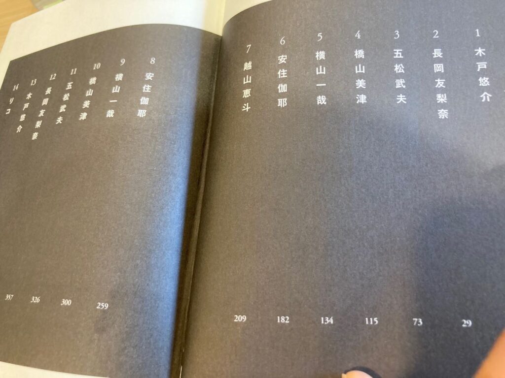目次をみるとズラッと登場人物が並んでいますが、よくみると線対称に並んでおり、最後に「リコ」で結ばれる感じ。